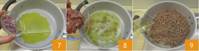 Then, in a pan, heat the olive oil and add the shallot 7, let it soften for 5 minutes, then add the sausage 8 and brown it for 4-5 minutes, then deglaze with the white wine 9. Let the wine evaporate,