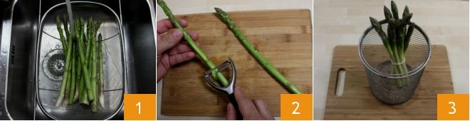 To prepare the asparagus stuffed rolls, start right from the How to clean asparagus: wash them under running water 1, then pat them dry with a kitchen towel and use a vegetable peeler to remove the fibrous part of the stem 2; then tie them with kitchen string and place them in the asparagus steamer basket 3.