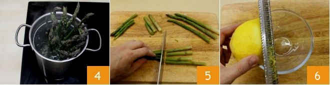 Cook them leaving the tips exposed 4 which will cook with steam (if you don't have an asparagus steamer, you can boil the asparagus horizontally in a wide pot). Once cooked, drain them and let them cool slightly then cut off the hardest part of the stem leaving the tips just a bit longer than the short side of the meat slices 5. Grate the zest of 1 lemon 6,