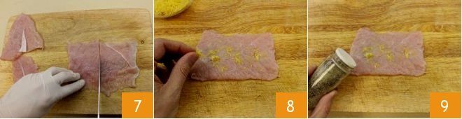 then pound the meat between two sheets of parchment paper to make the veal slices thinner without breaking the fibers of the meat and obtain 8 rectangles 7 to season with grated lemon zest 8, salt, and pepper to taste 9.