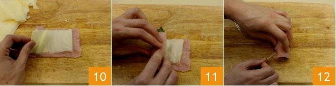 Place a bit of raspadura 10 and two asparagus tips on each slice; then roll to form the roll 11 and close it with a toothpick 12. Proceed in the same way until the ingredients are used up,