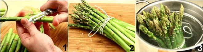 To prepare the asparagus with zabaglione, wash the asparagus, remove the white parts of the stalks, and scrape them to remove the tougher outer parts How to clean asparagus 1. Gather them into a bundle tied with kitchen string 2 and boil them in salted water for 10-15 minutes 3, until they are cooked but still firm. Drain them and keep them warm while you prepare the savory zabaglione.
