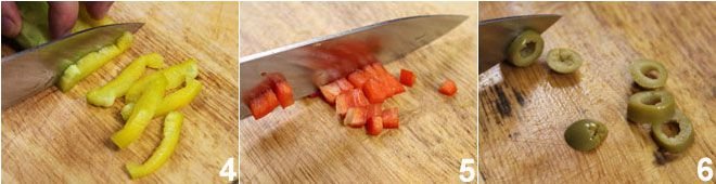 Prepare the vegetables: cut the peppers into 24 strips 4 from the yellow pepper and 24 strips from the red one and cut the remaining parts into cubes 5. Cut the olives into rings 6