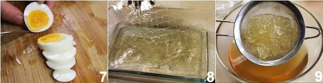 and the hard-boiled eggs, making 8 slices 7. Meanwhile, soak the gelatin sheets in cold water 8 and when they have softened, squeeze them well and dissolve them in 3-4 ladles of hot broth (which you can also put back on the heat) 9. Then add this liquid to the remaining vegetable broth and let the mixture cool at room temperature.