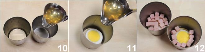 Now proceed with composing the aspic: prepare 8 steel molds with a capacity of 165 ml and note that each layer of beer gelatin, which will make up the multicolor aspic, will be 15 gr and will need 15-20 minutes in the fridge to set (or 10 minutes in the freezer). Start from the bottom by pouring a layer of gelatin equal to 15 gr 10 (to be sure, place the mold on a scale, tare it, and weigh the gelatin as you pour it). When the bottom has set, place a slice of hard-boiled egg in the center, cover it with gelatin 11, and let it set. Continue with diced cooked ham, being careful to arrange the ham in a radial pattern around the mold 12 for a very neat final effect, and complete with other cubes in the center.