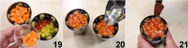 Then proceed to the peppers: arrange 3 strips of red pepper alternating with 3 strips of yellow pepper along the perimeter of the mold 16 and fill the center with pepper cubes 17. Always cover with gelatin and let it set. Finally, the final layer: arrange the olive circles alternating the colors around the mold 18
