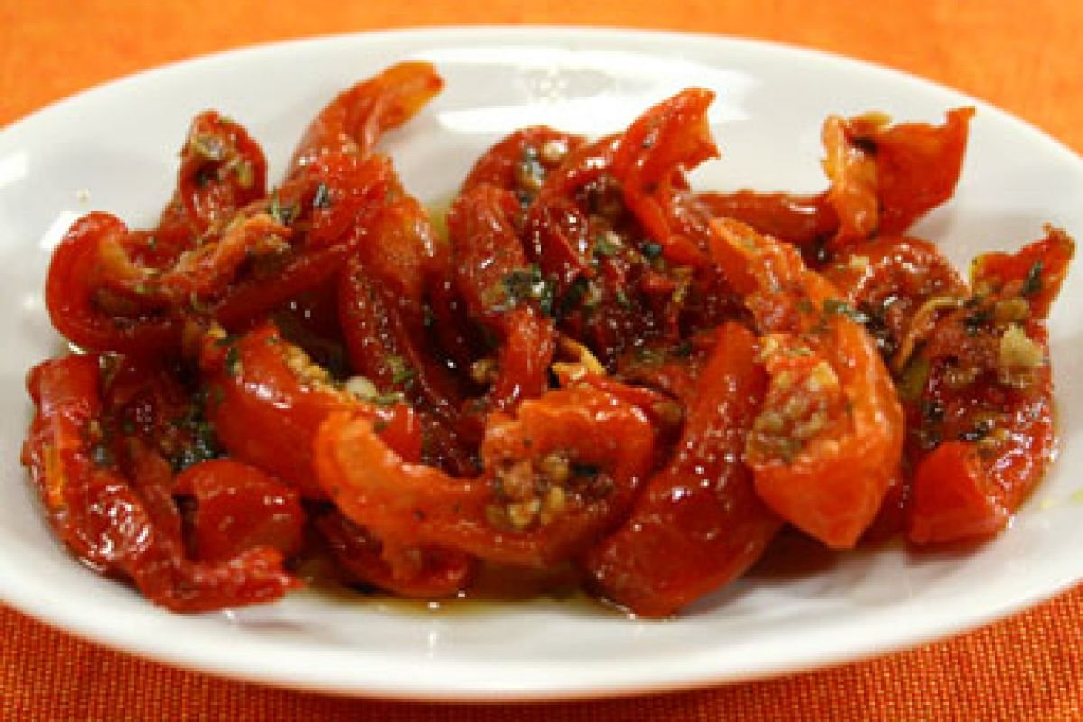 After cutting the tomatoes into quarters and drying them in the oven at low temperature for 5-6 hours, they are seasoned with a mixture of herbs, garlic, a little vinegar, and oil.