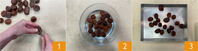 To prepare the autumn chicken, score the chestnuts 1 and soak them for a couple of hours 2, then place them on a baking sheet 3 and bake in a static oven at 350°F for about 30 minutes.