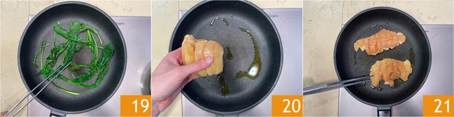 Season with salt and sauté for a few minutes to wilt them 19. Set these aside too, and in the same pan, add a final splash of oil, place the chicken breast 20, and brown it on both sides 21.