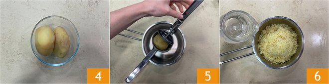 Pass the boiled potatoes 4 through a potato ricer 5 and put them in a saucepan with water 6.