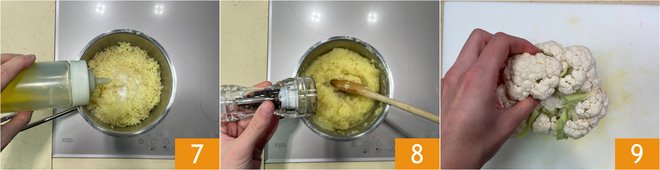 Add salt and oil 7, mix well, and cook over medium heat for a few minutes. Season with pepper and turn off the heat 8. Separate the cauliflower florets 9.