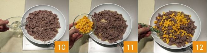 then deglaze with white wine 10 and let it evaporate. Add the reserved 1.8 oz of pumpkin 11, season with rosemary 12