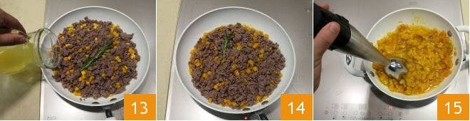 and continue cooking for 15-20 minutes, adding the vegetable broth 13 to prevent it from drying out. Once cooked 14, turn off the heat and set the ragù aside. In the meantime, the pumpkin will be ready 15; blend it with an immersion blender