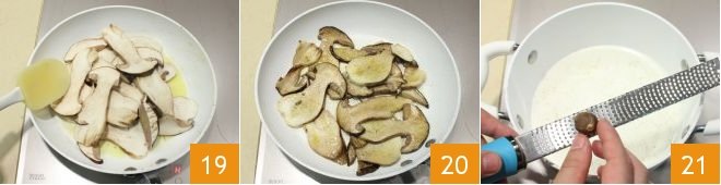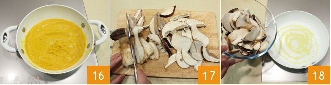 to make the cream 16. Clean the mushrooms: brush off any dirt, rinse them quickly if necessary, and dry them well with a cloth. Slice the mushrooms lengthwise 17, place them in a pan with a drizzle of oil and a clove of garlic 18