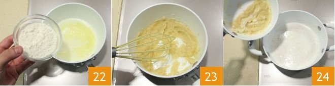 separately, melt the butter over low heat, then turn off the heat and add the sifted flour, stirring with a whisk to avoid lumps 22. Then put it back on low heat and stir until it turns golden to make the roux 23. Add the roux to the milk 24,