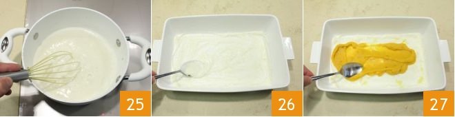 stirring vigorously with the whisk. Cook for 5-6 minutes over low heat until the sauce thickens 25. Everything is ready to assemble the lasagna: take a 8x12 inch baking dish, spread a layer of béchamel on the bottom 26, then a layer of pumpkin cream 27