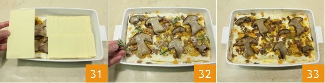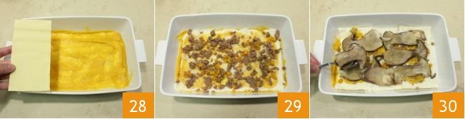 and place a first layer of lasagna sheets 28. Cover with the first layer of ragù 29 and then place the mushrooms on top 30,