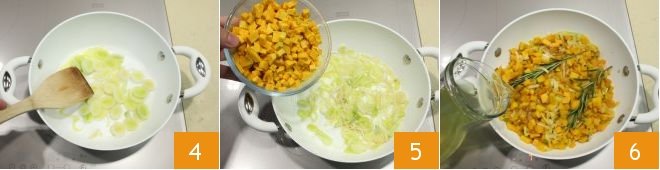 In a pan, heat a drizzle of olive oil and sauté the leek over medium-high heat for a couple of minutes 4. Then add the diced pumpkin, keeping 1.8 oz aside for the ragù 5, the rosemary, and continue cooking over medium heat, adding the vegetable broth little by little 6, as it is absorbed by the pumpkin. Cook for about 20 minutes or until the pumpkin is soft.
