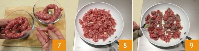 Meanwhile, prepare the ragù: remove the casing 7 and crumble the sausage, placing it in a large pan 8, season with fennel seeds 9, and brown it with a drizzle of oil,