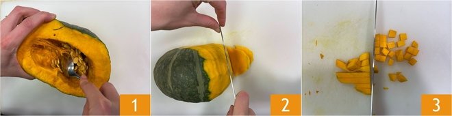 To prepare the autumn rice salad, first, put a pot full of salted water on the stove, which will be used to cook the rice. While it comes to a boil, take the pumpkin, remove the seeds inside 1, and peel it 2. First, cut it into slices and then into cubes of about 0.4 inches 3.