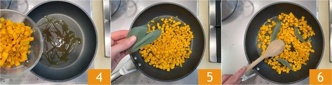 In a pan, pour a drizzle of oil, add the pumpkin 4, and add 3-4 sage leaves 5. Season with salt and sauté over medium-high heat for about 10 minutes 6 until it is soft and well-browned.
