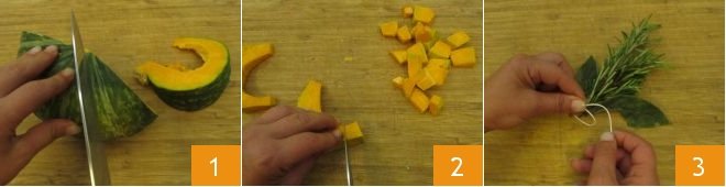To make the autumn soup, start by cutting the pumpkin into slices 1, remove the skin, then cut the flesh into cubes of about 3/4 inch 2. Tie the bay leaves and rosemary sprigs together with string 3, so they will be easier to remove at the end of cooking.