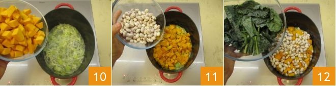 When the leek is stewed, add the diced pumpkin 10, shelled beans 11, and black cabbage 12.