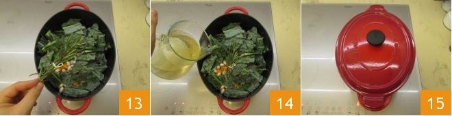 Finally, add the bundle of aromatic herbs 13, cover the vegetables with broth 14 so that they are completely immersed in the liquid, then cover with the lid 15 and let it cook for about 2 hours; stir occasionally.