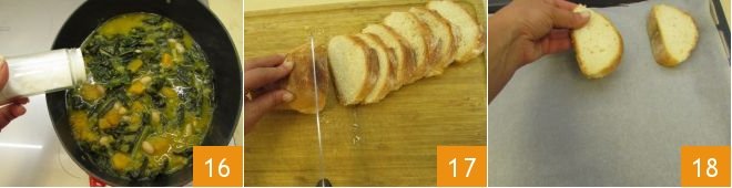 After the cooking time, the vegetables will be tender; remove the herb bundle, salt 16 and pepper to taste, then keep warm. Slice the loaf of bread 17, place the slices on a baking sheet lined with parchment paper 18,