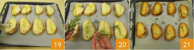 season with olive oil 19, a pinch of salt, and rosemary needles 20, then toast the bread until golden 21 in a preheated static oven at 464°F in grill mode for 3-4 minutes.