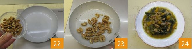 Now place the walnut kernels in a very hot pan 22 (you can leave them whole or coarsely crumble them), toast them for 3 minutes to brown them by shaking the pan to prevent burning 23, then add them to the soup. Serve the autumn soup hot 24 accompanied by toasted bread croutons.