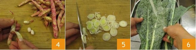 Shell the beans 4 and collect them in a bowl. Trim the base of the leek, remove the tougher green part and the first two leaves, then slice it into rings 5. Wash the black cabbage leaves 6.