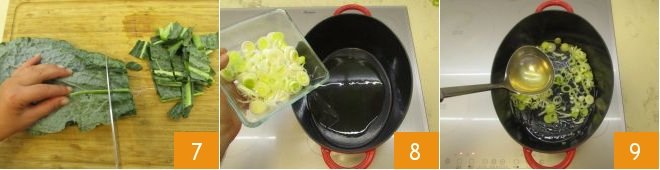 And chop them coarsely 7. The ingredients are ready for cooking: heat the olive oil in a large pot, add the sliced leek 8, let it brown for 1 minute, then cover with a ladle of broth 9 and let it simmer for 5-6 minutes.