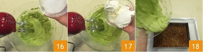 the sugar 16, and the mascarpone 17 and work until you obtain a homogeneous cream. After the base has set, take it out of the fridge, pour the avocado cream over it 18,