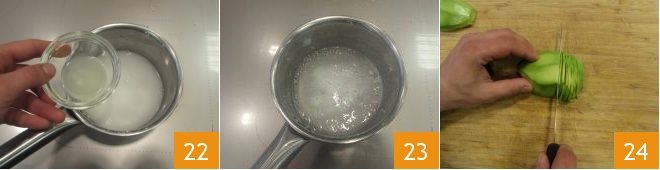 and 1/2 tbsp of lime juice 22; mix everything with a manual whisk on low heat for about a couple of minutes 23. Remove the gelatin from the heat and let it cool; to help you, you can pour it into a small jug. While the gelatin is cooling, clean the third avocado: proceed like the others, halving it, removing the pit, and extracting the flesh, then cut only half into very thin slices 24.
