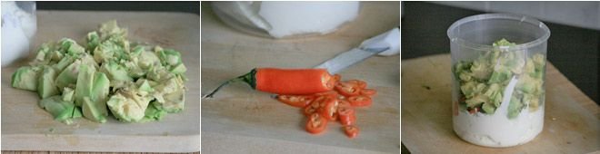 Wash the chili pepper and slice half of it; place the avocado, chili pepper, and yogurt in a bowl, then blend the ingredients until they become a smooth, lump-free cream, finally season with salt and pepper.