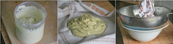 Place the cream on a dry and clean cloth; close the cloth and put it inside a strainer placed over a bowl that will collect the yogurt whey.