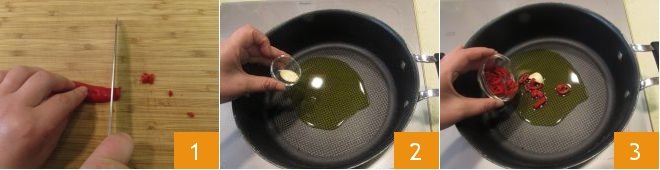 To prepare baby octopus with peas, first cut the fresh chili pepper into rings 1 and peel the garlic. In a large pan, pour in the oil, the peeled garlic clove 2, the chili pepper 3, and sauté for a few seconds over high heat.