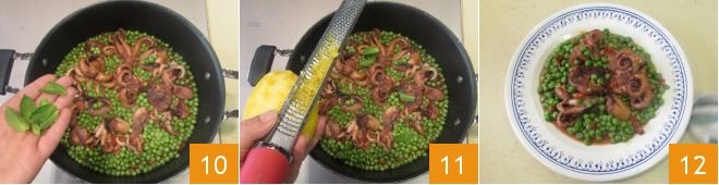 Continue cooking without the lid for another 10 minutes. Turn off the heat and flavor with mint leaves 10 and grated lemon zest 11. The baby octopus with peas is ready, just serve it up 12!