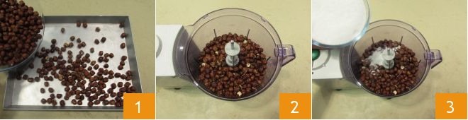 To prepare the Baci di Alassio, place the hazelnuts on a baking sheet 1 and toast them in a static preheated oven at 350°F for 8-10 minutes. Then let them cool slightly and transfer them to a food processor 2. Add the sugar 3