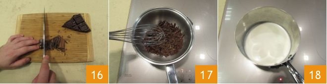 Finely chop the chocolate 16, put it in a bowl, and start melting it in a bain-marie, gently stirring with a whisk 17. Meanwhile, in a separate saucepan, heat the cream until it is almost boiling 18