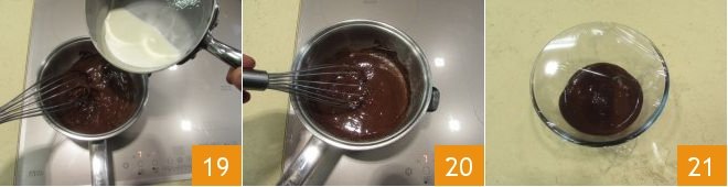 and pour it directly into the already melted chocolate 19. Stir until you get a smooth ganache and transfer it to a bowl, covering it with plastic wrap 21, and let it cool for 15-20 minutes at room temperature.