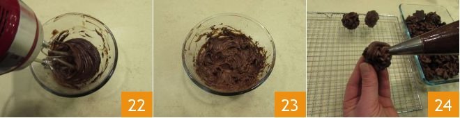 Only when it is lukewarm, whip it with the mixer 22 until it is completely cooled. Once you have obtained a thick and fluffy cream 23, transfer it into a pastry bag 24. Take one of the cookies and using the pastry bag, squeeze a tuft of cream onto the flat side 24.