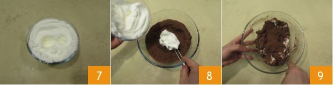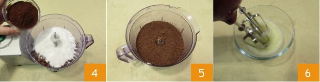 the cocoa 4 and blend everything. Once you have obtained a powder as fine as possible 5, transfer it to a large bowl; separately, in another bowl, start whipping the egg whites with a mixer 6
