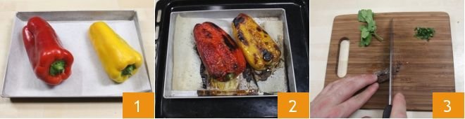 Finally, break the basil leaves with your hands and add them to the filling. When the peppers have cooled, remove the green stem 11 and peel them 12: the skin will come off easily, but during this operation be careful not to break them.