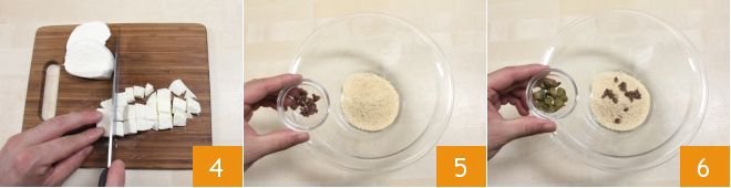 Place the mozzarella on a cutting board and dice it 4. Then, place the breadcrumbs in a large bowl and add the chopped anchovy and capers (5-6).