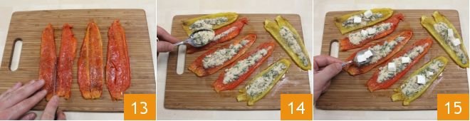 Open the peppers, remove the internal seeds and obtain 8 fairly wide fillets 13. Lay the opened fillets on a cutting board and sprinkle them with the previously prepared breadcrumb mixture 14. Place a couple of small mozzarella cubes in the center of each fillet 15.