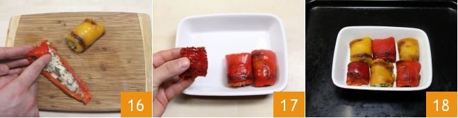 Gently roll the stuffed peppers to form rolls 16 and place them in a baking dish that you have lightly oiled beforehand 17. Bake for about 10 minutes at 392°F and then take them out: your baked bell pepper rolls are ready to be served warm 18!