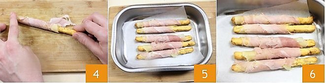 Roll up the cooked ham slice in the same way 4. Arrange the decorated breadsticks in a baking dish lined with parchment paper 5. Bake in a preheated static oven at 375°F (320°F in a convection oven) for five minutes until the cheese melts 6.