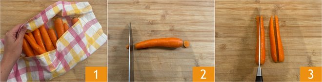 To prepare the baked carrots, first wash them thoroughly, then dry them with a clean dish towel 1. Trim the ends 2 and slice them in half lengthwise 3.
